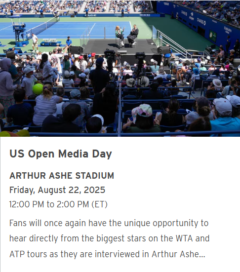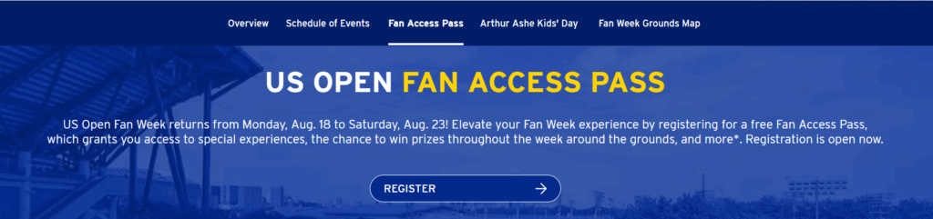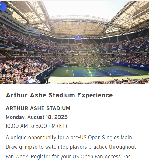Register today for your US Open Fan Access Pass to get into even more events. The Fan Access Pass is completely free, takes 2 minutes to sign-up and gives you even more options during Fan Week. During Fan Week, you can enter Arthur Ashe Stadium to watch the top players practice and can hang out at the Advantage Arena gaming zone. On Friday, August 22 – Fan Access pass holders can head to the US Open Media Day from 12:00-2:00pm at Arthur Ashe Stadium and stick around for the US Open Block party from 7:00-10:00pm.