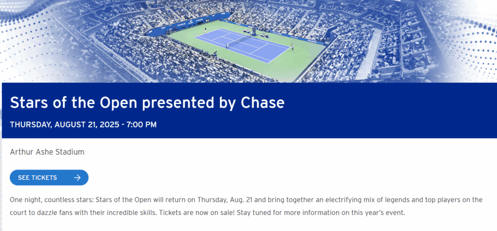 Chase Bank is also a sponsor of the US Open Tennis Championships. They host the Stars of the US Open on Thursday, August 21 and offer deals for seating (TBD at the time of posting). Like American Express, there is a Chase Lounge open for customers. In the past, reservations were required starting the first day of play on August 24, with first-come, first serve access during Fan Week. Sign up at Chase Experiences to make reservations.