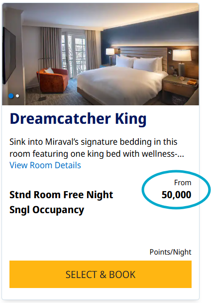 Miraval Berkshires Resort and Spa is a wellness focused, adults only all-inclusive resort. Since it includes meals in the stay a single occupancy room mid-week in August has a cash price of $1250 with taxes and fee and the points price is 50,000 points. This is a value of $0.025/point. There are no additional resort fees, so your entire stay can be covered with points. I have just been to Miraval for a spa day and it was a FANTASTIC experience. They offer so many activities and the food and service is topnotch.