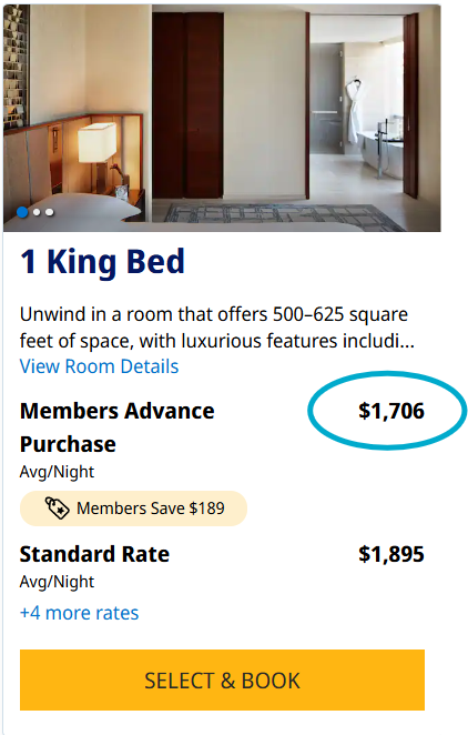 One way to get extremely outsized value is to book when the cash prices are high, due to an event in the area and room prices are totally out of budget! (Think Taylor Swift concerts or huge sporting events) If our family wanted to stay in NYC for the Macy’s parade over Thanksgiving, it would cost ~$1900/night with taxes and fees. The points price is 45,000 points. This is a value of $0.042/point!