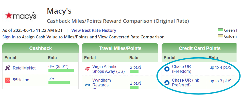 If you are looking to add to your Chase Ultimate Rewards points – focus on the Chase Shopping portals. If you have more than one card (Chase Sapphire Preferred or Chase Freedom) note that different rates might be available for your purchases.