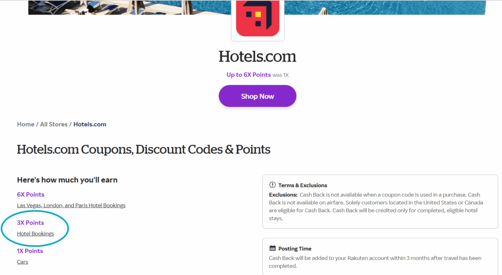 To earn points, make sure you are logged in. Type the store in the search bar and view the terms for earning points. In this case at Hotels.com, you will earn 6x for specific locations (Las Vegas, London and Paris hotels) and 3x at other hotel bookings. Click on shop now and you will go directly to the hotels.com webpage.